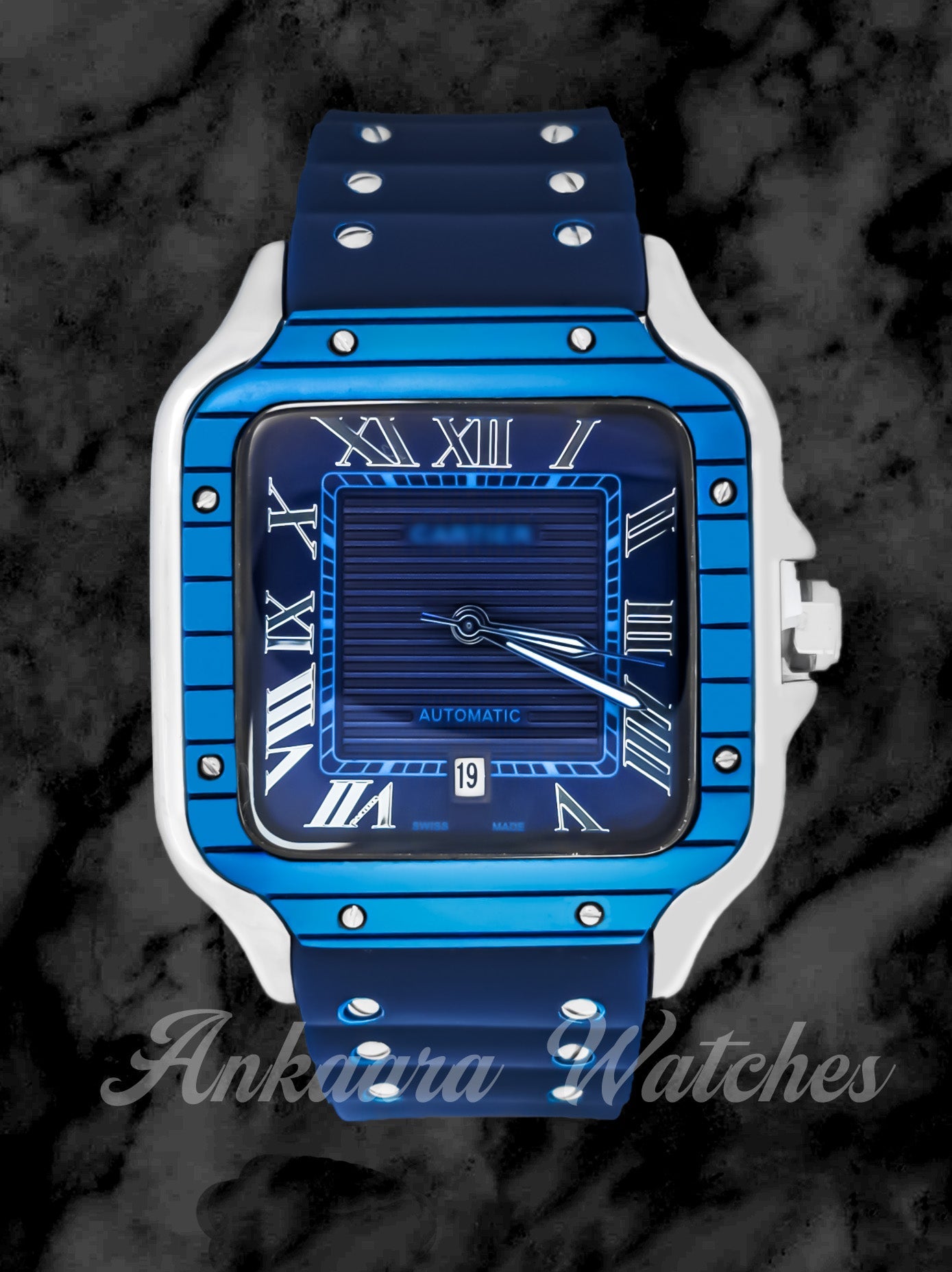 This timepiece effortlessly blends elegance and athleticism. Its striking blue dial, a masterpiece of minimalist design, contrasts beautifully against a sophisticated black rubber strap. A perfect fusion of luxury and modern style, this watch is a statement piece for the discerning wrist.